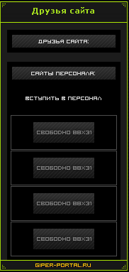 Code <tr><td class="boxContent"><!-- <bc> --><table border="0" width="100%" cellspacing="1" cellpadding="2" class="eBlock"> <tr> <td align="center"> <center> <table border="0" width="100%" cellspacing="2" cellpadding="3"> <tr> <td style="border:1px solid #000000;" width="100%" height="5" background=http://s60.radikal.ru/i170/1010/31/8c509df2337a.png><center> <font face="Visitor_rus" size="1"><a title="" onclick="$('#frendbanner').slideToggle('slow');" href="javascript://;">Друзья сайта:</a></font> </center></td> </tr> </table> <div id="frendbanner" style="display:none"> <div id="info5"> <center><table align="center" border="0" cellspacing="0" cellpadding="0" width="100%" class="infTable"><tr><td class="infTd" width="20%"> <br><center><table class="eBlock"><td><font size="1.5" face="Visitor_Rus"><a href="http://giper-portal.ru/forum/128-635-1">Заказать рекламу</a></font></td></table></center> <br> <table border="0" cellpadding="2" cellspacing="1" width="100%"> <tbody> <tr> <td class="bBlok2"><table width="100%"><tr><td align="center"><img border="0" align="absmiddle" src="http://s005.radikal.ru/i211/1010/96/ee3f9c98fe68.png"></td></tr></table></td> </tr> <tr> <td class="bBlok2"><table width="100%"><tr><td align="center"><img border="0" align="absmiddle" src="http://s005.radikal.ru/i211/1010/96/ee3f9c98fe68.png"></td></tr></table></td> </tr> </tbody></table> </td></tr></table></center> </div> </div> </td></tr> </table> <br> <table border="0" width="100%" cellspacing="1" cellpadding="2" class="eBlock"> <tr> <td align="center"> <center> <table border="0" width="100%" cellspacing="2" cellpadding="3"> <tr> <td style="border:1px solid #000000;" width="100%" height="5" background=http://s60.radikal.ru/i170/1010/31/8c509df2337a.png><center> <font face="Visitor_rus" size="1"> <a title="" onclick="$('#personal').slideToggle('slow');" href="javascript:showOnlineUsers//;">Сайты персонала:</a> </center></td> </tr> </table> <div id="personal" style="display:none"> <div id="info5"> <center><table align="center" border="0" cellspacing="0" cellpadding="0" width="100%" class="infTable"><tr><td class="infTd" width="20%"> <br><center><table class="eBlock"><td><font size="1.5" face="Visitor_Rus"><a href="http://giper-portal.ru/forum/128-1379-1#5148">Вступить в персонал</a></font></td></table></center> <br> <table border="0" cellpadding="2" cellspacing="1" width="100%"> <tbody> <tr> <td class="bBlok2"><table width="100%"><tr><td align="center"><img border="0" align="absmiddle" src="http://s005.radikal.ru/i211/1010/96/ee3f9c98fe68.png"></td></tr></table></td> </tr> <tr> <td class="bBlok2"><table width="100%"><tr><td align="center"><img border="0" align="absmiddle" src="http://s005.radikal.ru/i211/1010/96/ee3f9c98fe68.png"></td></tr></table></td> </tr> <tr> <td class="bBlok2"><table width="100%"><tr><td align="center"><img border="0" align="absmiddle" src="http://s005.radikal.ru/i211/1010/96/ee3f9c98fe68.png"></td></tr></table></td> </tr> <tr> <td class="bBlok2"><table width="100%"><tr><td align="center"><img border="0" align="absmiddle" src="http://s005.radikal.ru/i211/1010/96/ee3f9c98fe68.png"></td></tr></table></td> </tr> </tbody></table> </td></tr></table></center> </div> </div> </td></tr> </table> |
