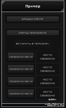 Code <table border="0" width="100%" cellspacing="1" cellpadding="2" class="eBlock"> <tr> <td align="center"> <center> <table border="0" width="100%" cellspacing="2" cellpadding="3"> <tr> <td style="border:1px solid #000000;" width="100%" height="5" background=http://s60.radikal.ru/i170/1010/31/8c509df2337a.png><center> <font face="Visitor_rus" size="1"><a title="" onclick="$('#frendbanner').slideToggle('slow');" href="javascript://;">Друзья сайта:</a></font> </center></td> </tr> </table> <div id="frendbanner" style="display:none"> <div id="info5"> <center><table align="center" border="0" cellspacing="0" cellpadding="0" width="100%" class="infTable"><tr><td class="infTd" width="20%"> <br><center><table class="eBlock"><td><font size="1.5" face="Visitor_Rus"><a href="/forum/16-14-1">Заказать рекламу</a></font></td></table></center> <br> <table border="0" cellpadding="2" cellspacing="1" width="100%"> <tbody> <tr> <td class="bBlok2"><table width="100%"><tr><td align="center"><img border="0" align="absmiddle" src="http://s005.radikal.ru/i211/1010/96/ee3f9c98fe68.png"></td></tr></table></td> <td class="bBlok2"><table width="100%"><tr><td align="center"><font size="1.5" face="Visitor_Rus"><a href="/forum/16-14-1" target="_blank">Место свободно</a></font></td></tr></table></td> </tr> <tr> <td class="bBlok2"><table width="100%"><tr><td align="center"><img border="0" align="absmiddle" src="http://s005.radikal.ru/i211/1010/96/ee3f9c98fe68.png"></td></tr></table></td> <td class="bBlok2"><table width="100%"><tr><td align="center"><font size="1.5" face="Visitor_Rus"><a href="/forum/16-14-1" target="_blank">Место свободно</a></font></td></tr></table></td> </tr> <tr> <td class="bBlok2"><table width="100%"><tr><td align="center"><img border="0" align="absmiddle" src="http://s005.radikal.ru/i211/1010/96/ee3f9c98fe68.png"></td></tr></table></td> <td class="bBlok2"><table width="100%"><tr><td align="center"><font size="1.5" face="Visitor_Rus"><a href="/forum/16-14-1" target="_blank">Место свободно</a></font></td></tr></table></td> </tr> <tr> <td class="bBlok2"><table width="100%"><tr><td align="center"><img border="0" align="absmiddle" src="http://s005.radikal.ru/i211/1010/96/ee3f9c98fe68.png"></td></tr></table></td> <td class="bBlok2"><table width="100%"><tr><td align="center"><font size="1.5" face="Visitor_Rus"><a href="/forum/16-14-1" target="_blank">Место свободно</a></font></td></tr></table></td> </tr> </tbody></table> </td></tr></table></center> </div> </div> </td></tr> </table> <br> <table border="0" width="100%" cellspacing="1" cellpadding="2" class="eBlock"> <tr> <td align="center"> <center> <table border="0" width="100%" cellspacing="2" cellpadding="3"> <tr> <td style="border:1px solid #000000;" width="100%" height="5" background=http://s60.radikal.ru/i170/1010/31/8c509df2337a.png><center> <font face="Visitor_rus" size="1"> <a title="" onclick="$('#personal').slideToggle('slow');" href="javascript:showOnlineUsers//;">Сайты персонала:</a> </center></td> </tr> </table> <div id="personal" style="display:none"> <div id="info5"> <center><table align="center" border="0" cellspacing="0" cellpadding="0" width="100%" class="infTable"><tr><td class="infTd" width="20%"> <br><center><table class="eBlock"><td><font size="1.5" face="Visitor_Rus"><a href="/forum/22">Вступить в персонал</a></font></td></table></center> <br> <table border="0" cellpadding="2" cellspacing="1" width="100%"> <tbody> <tr> <td class="bBlok2"><table width="100%"><tr><td align="center"><img border="0" align="absmiddle" src="http://s005.radikal.ru/i211/1010/96/ee3f9c98fe68.png"></td></tr></table></td> <td class="bBlok2"><table width="100%"><tr><td align="center"><font size="1.5" face="Visitor_Rus"><a href="/forum/22">Место свободно</a></font></td></tr></table></td> </tr> <tr> <td class="bBlok2"><table width="100%"><tr><td align="center"><img border="0" align="absmiddle" src="http://s005.radikal.ru/i211/1010/96/ee3f9c98fe68.png"></td></tr></table></td> <td class="bBlok2"><table width="100%"><tr><td align="center"><font size="1.5" face="Visitor_Rus"><a href="/forum/22">Место свободно</a></font></td></tr></table></td> </tr> <tr> <td class="bBlok2"><table width="100%"><tr><td align="center"><img border="0" align="absmiddle" src="http://s005.radikal.ru/i211/1010/96/ee3f9c98fe68.png"></td></tr></table></td> <td class="bBlok2"><table width="100%"><tr><td align="center"><font size="1.5" face="Visitor_Rus"><a href="/forum/22" target="_blank">Место свободно</a></font></td></tr></table></td> </tr> <tr> <td class="bBlok2"><table width="100%"><tr><td align="center"><img border="0" align="absmiddle" src="http://s005.radikal.ru/i211/1010/96/ee3f9c98fe68.png"></td></tr></table></td> <td class="bBlok2"><table width="100%"><tr><td align="center"><font size="1.5" face="Visitor_Rus"><a href="/forum/22" target="_blank">Место свободно</a></font></td></tr></table></td> </tr> </tbody></table> </td></tr></table></center> </div> </div> </td></tr> </table> Ставим в любое место
